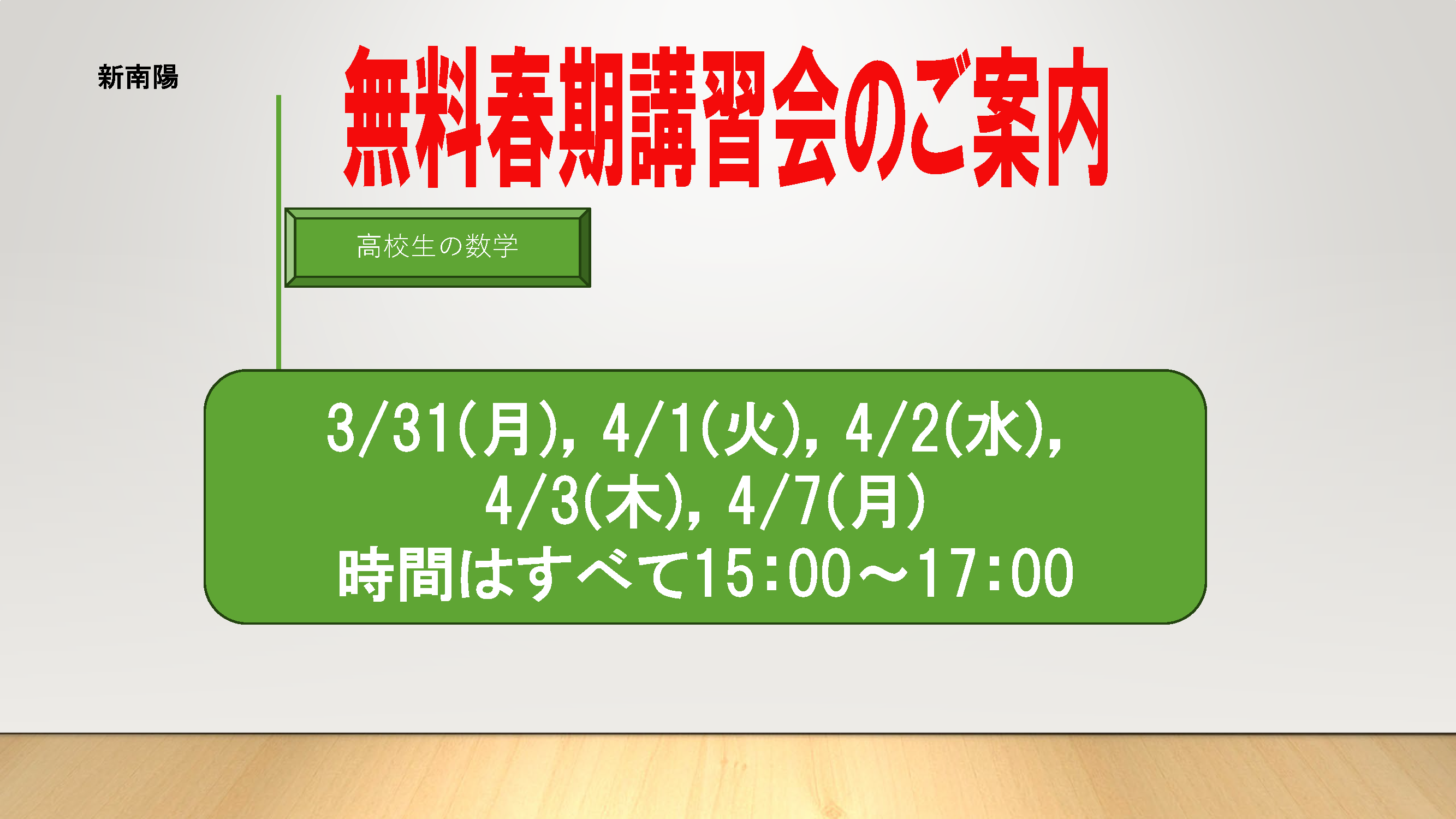【新南陽校】3月無料勉強会 春期講習のご案内 3月無料勉強会を開催いたします。全学年対象 参加希望の方はメールでご連絡ください 【新中1対象】春期講習を開催します 【新中3対象】春期講習会今から始める受験対策!